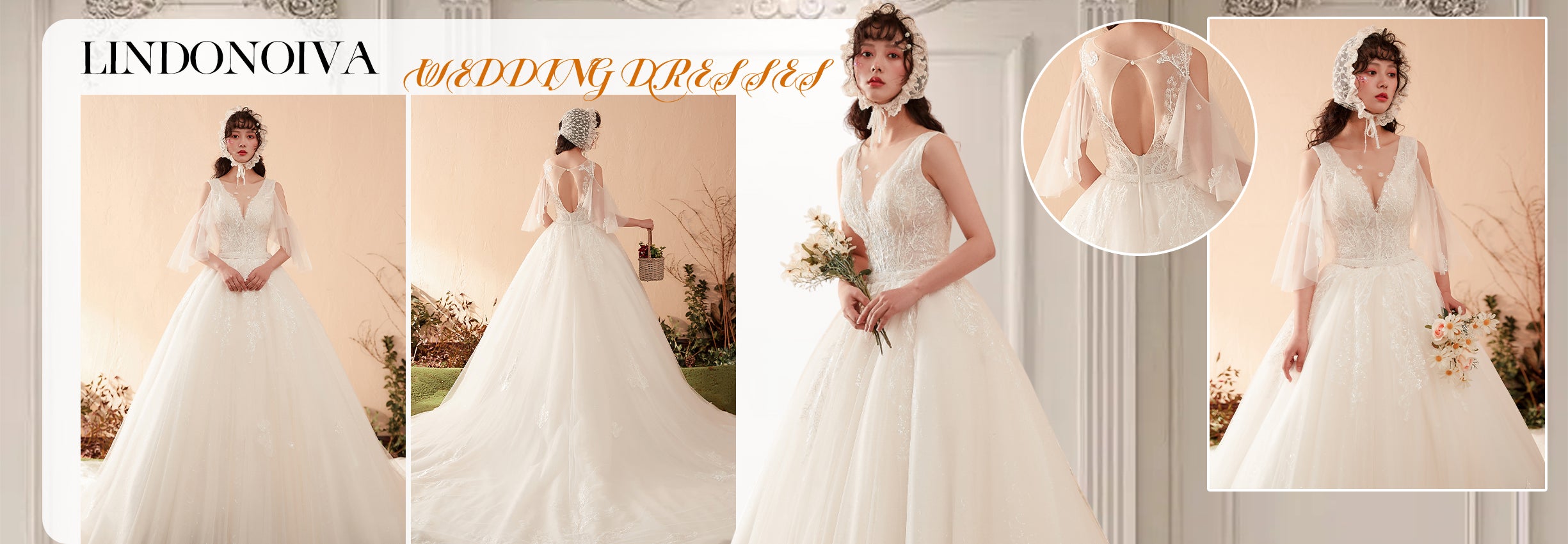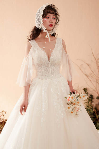 This elegant bridal gown is inspired by romantic vintage aesthetics, designed to create a unique wedding look. Made from soft and lightweight tulle fabric, the dress showcases a classic A-line silhouette that flatters a variety of body types. The bodice is adorned with exquisite lace embroidery, exuding timeless elegance. Featuring off-shoulder sheer flutter sleeves and a deep V-neckline, the gown adds a touch of dreamy femininity. Subtle sparkling details embellish the skirt, creating a magical effect as you move.