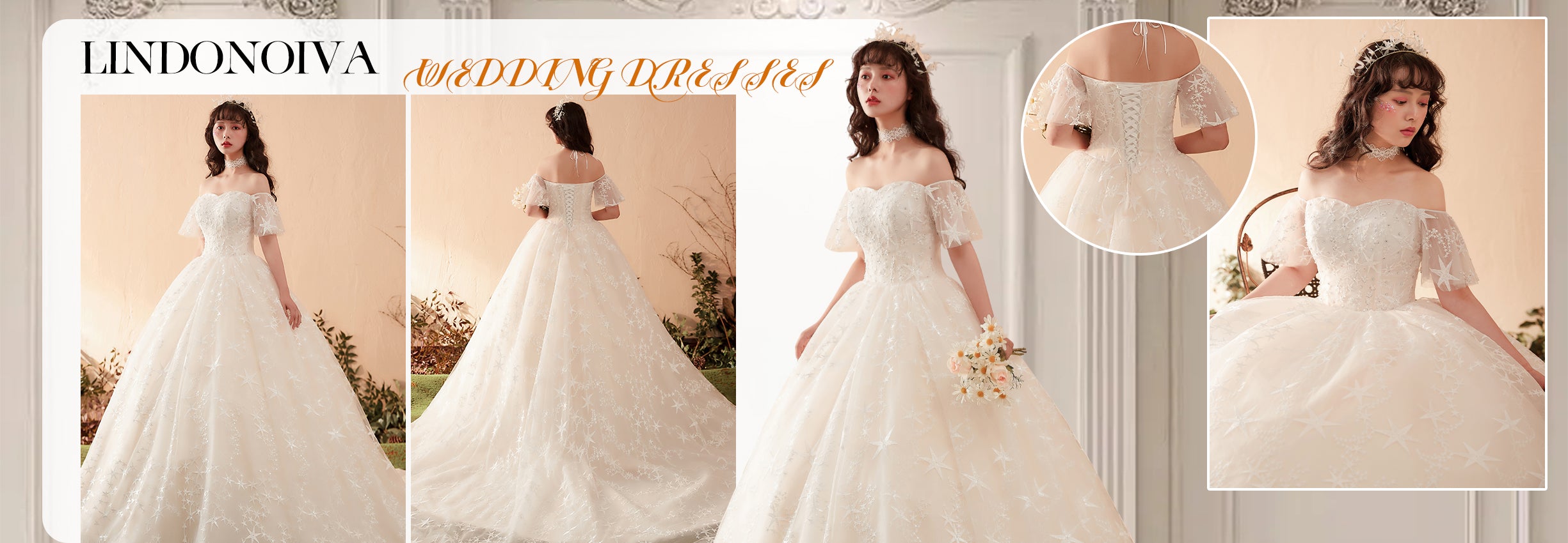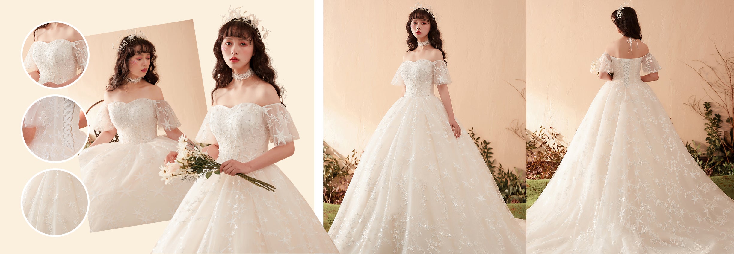 Ethereal Off-Shoulder Ball Gown Wedding Dress with Starry Embroidery
